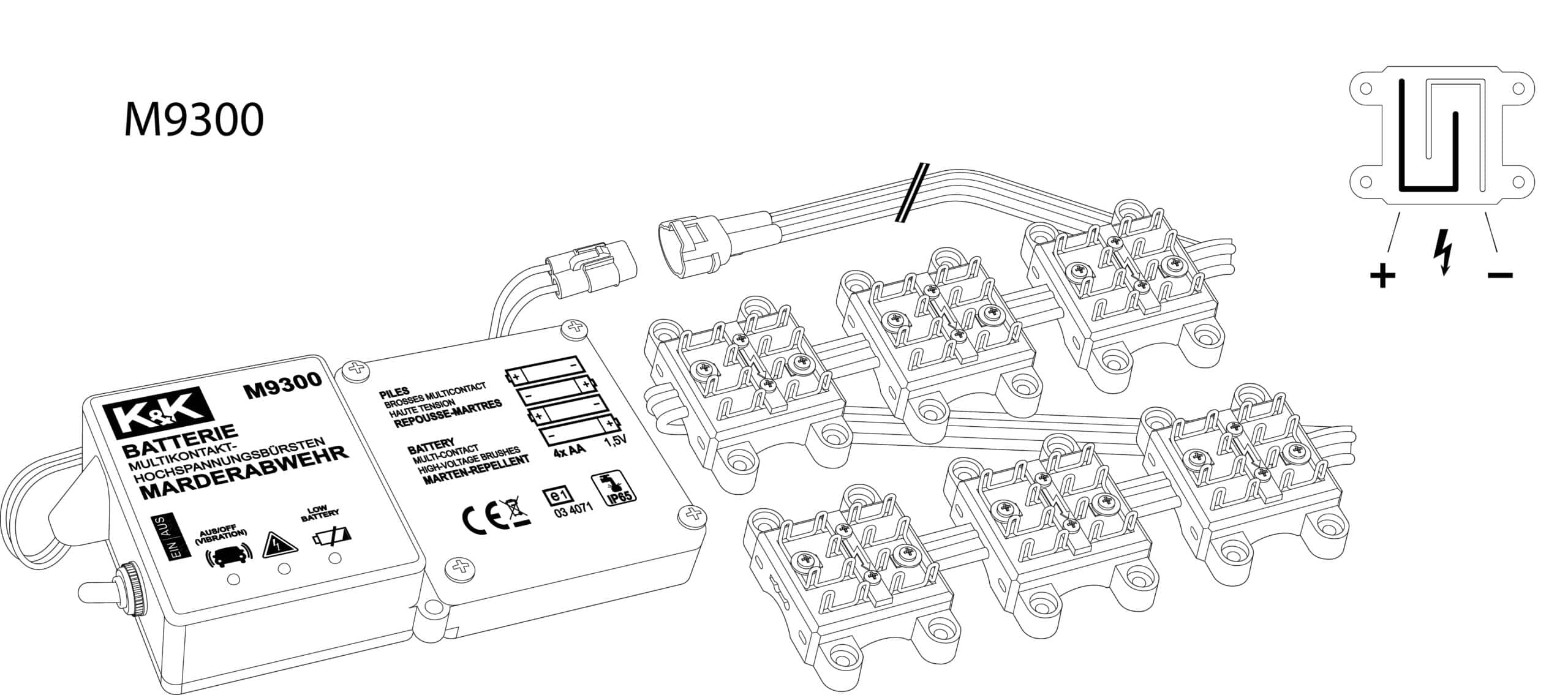The 6 high voltage multi-contact brushes chase the marten away by electric shocks, which are triggered by contact. Not only the sensitive paws and snout offer a potential attack surface, but also the entire body of the animal, as the brushes penetrate the dense and otherwise insulating fur and come into direct contact with the skin. However, the animal is not injured or even killed. Due to its absolute waterproofness, the product can also be installed in the splash water area and thus particularly deep in the engine compartment, thus guarding the entry area of the marten which is particularly worthy of protection.